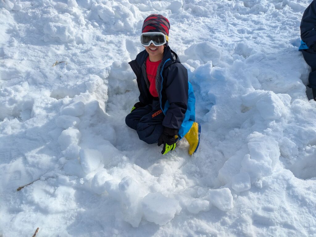 2泊3日の日程で行われたプログラムでは、子どもたちは様々な活動に挑戦しました。まずは真っ白な雪原での「基地作り」!! ふかふかの雪を前に、子どもたちは夢中で作業に取り組んでいました。 一言で「基地」と言っても、形はさまざま。「ひたすら高く雪を積み上げる子」「居心地の良さを追求して中を広げる子」「入り口の造形にこだわる子」。写真はアングルの都合でありませんが、それぞれの「個性」がキラリと光る、世界にひとつだけの基地が完成しました。